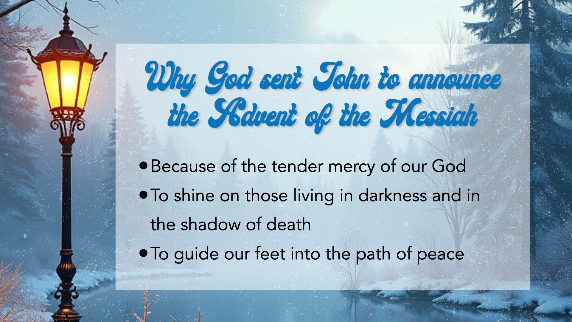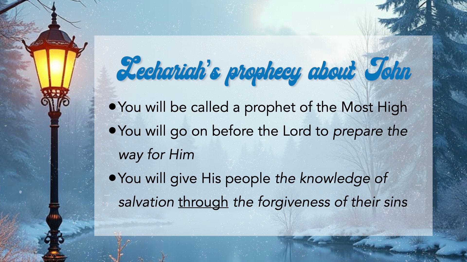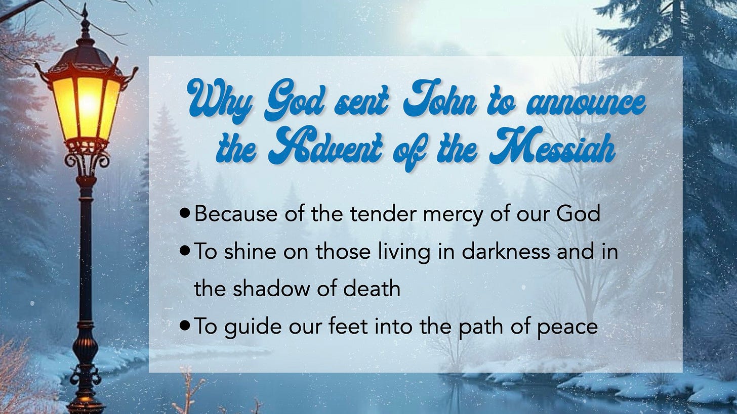 And you, my child, will be called a prophet of the Most High; for you will go on before the Lord to prepare the way for him, to give his people the knowledge of salvation through the forgiveness of their sins, because of the tender mercy of our God, by which the rising sun will come to us from heaven to shine on those living in darkness and in the shadow of death, to guide our feet into the path of peace.” (Luke 1:67-80)