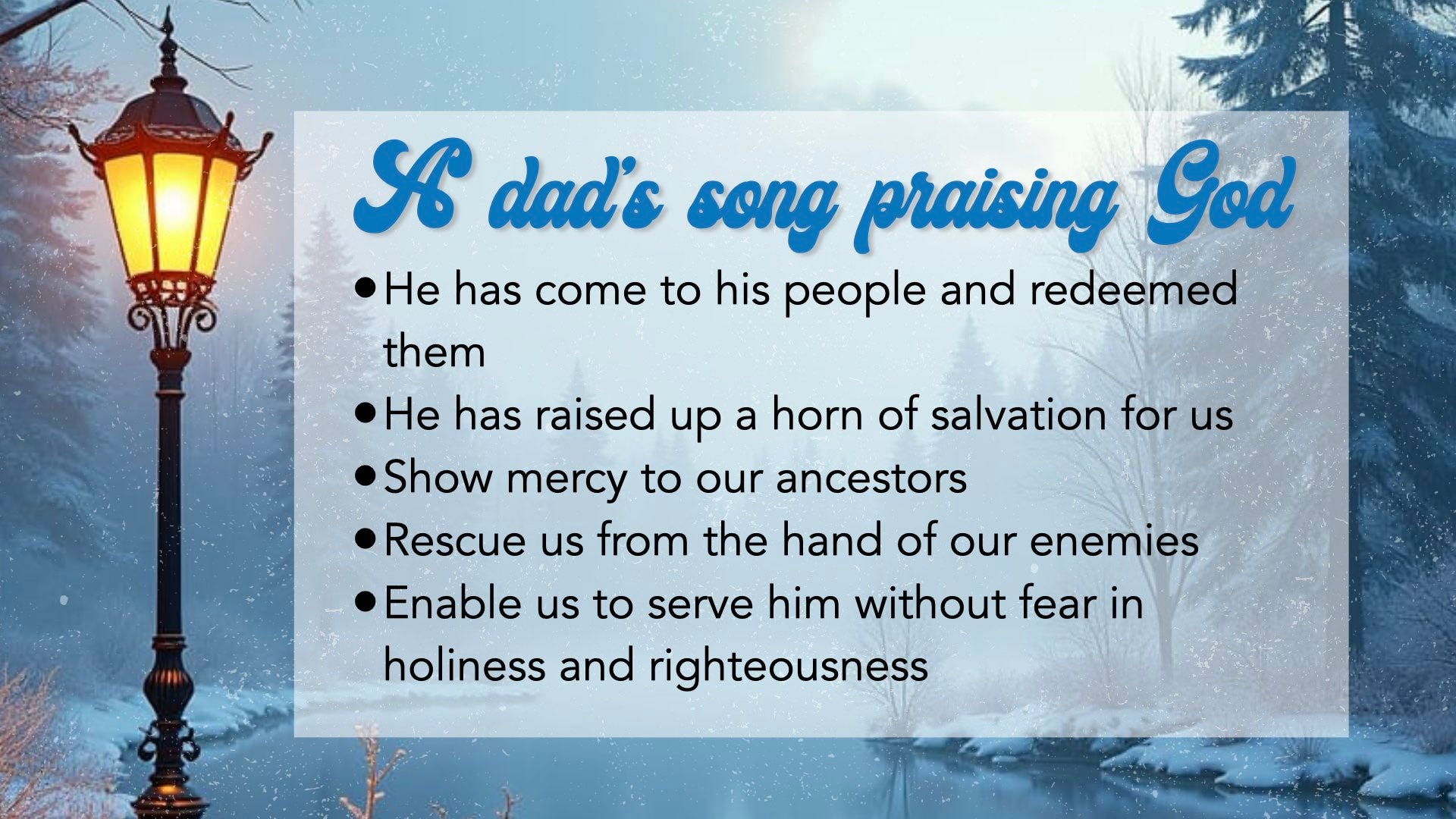 “Praise be to the Lord, the God of Israel, because he has come to his people and redeemed them. He has raised up a horn of salvation for us in the house of his servant David (as he said through his holy prophets of long ago), salvation from our enemies and from the hand of all who hate us— to show mercy to our ancestors and to remember his holy covenant, the oath he swore to our father Abraham: to rescue us from the hand of our enemies, and to enable us to serve him without fear in holiness and righteousness before him all our days.