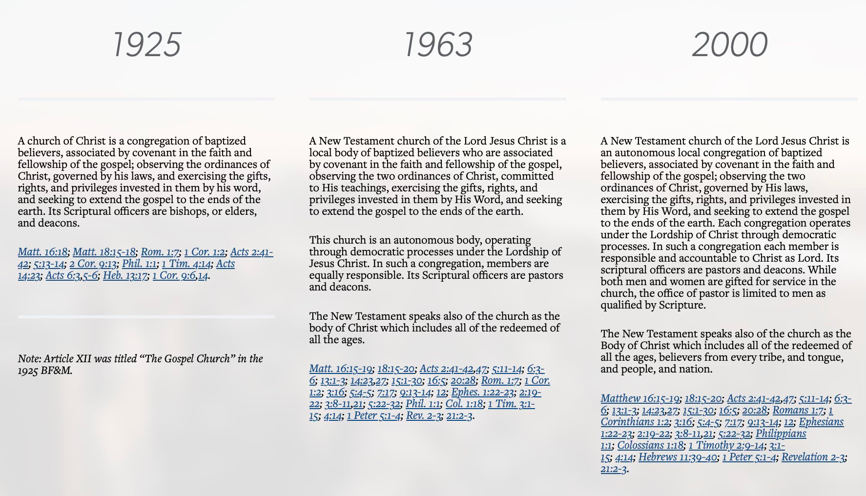 “A New Testament church of the Lord Jesus Christ is an autonomous local congregation of baptized believers… Its two scriptural offices are that of pastor/elder/overseer and deacon. While both men and women are gifted for service in the church, the office of pastor/elder/overseer is limited to men as qualified by Scripture.”4