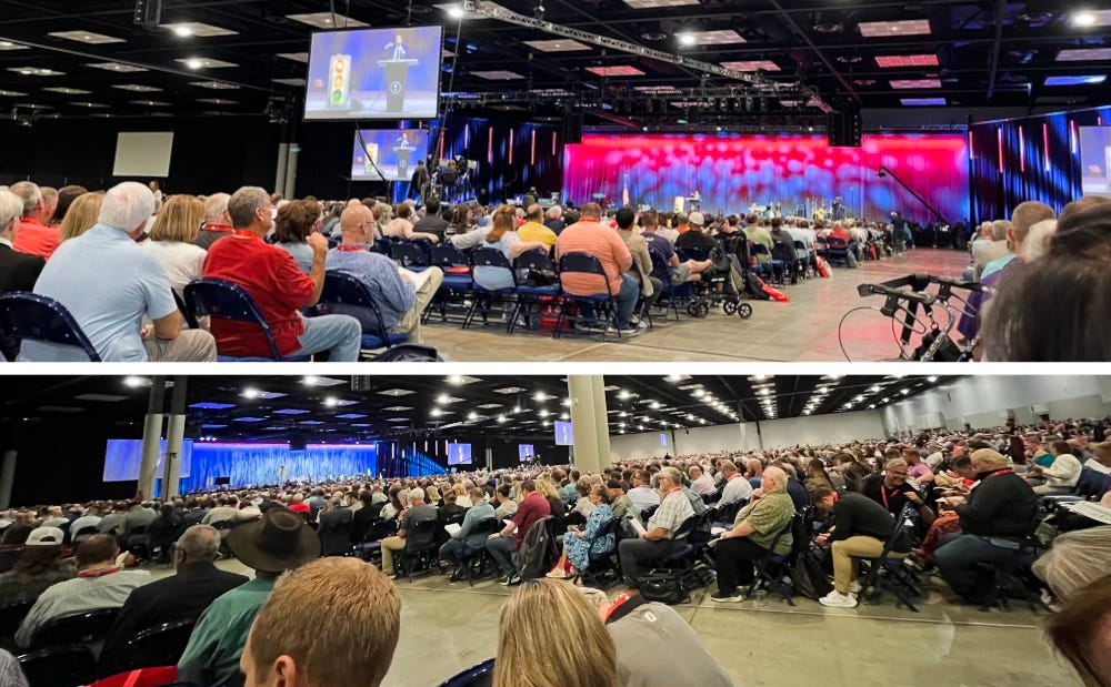 Last week marked my first experience of the Southern Baptist Convention’s annual meeting. Carolyn and I attended as representatives of our church in Blacksburg, and we slowly stood, somewhat shyly, as they asked all first-time messengers1 to stand. Some friends from Arkansas that we were sitting with grinned at us as we stood. I have been in Southern Baptist ministry since I was 19! That means I’d successfully avoided the SBC annual meeting for 37 years. (more on that later)