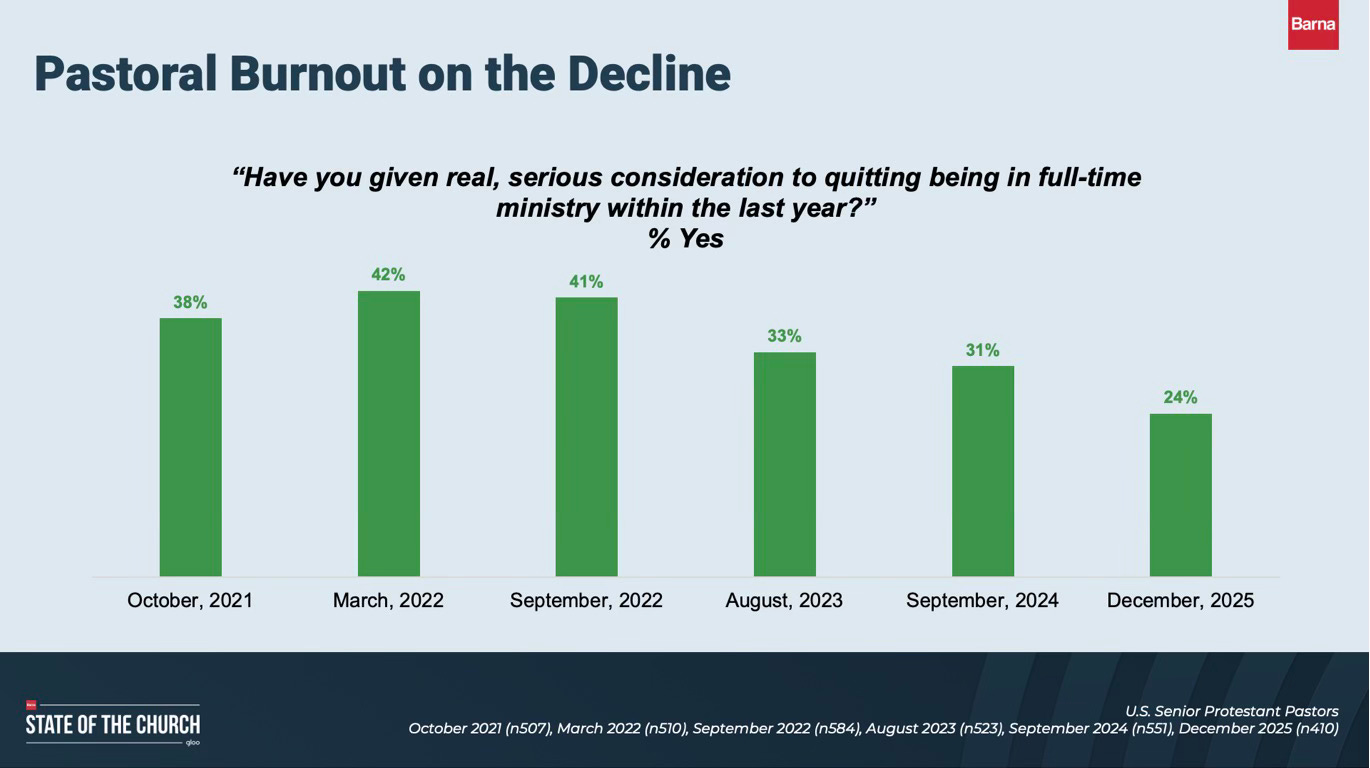 In these post-COVID years, the percentage of pastors wanting to quit has dropped precipitously from 42% to 24%.4