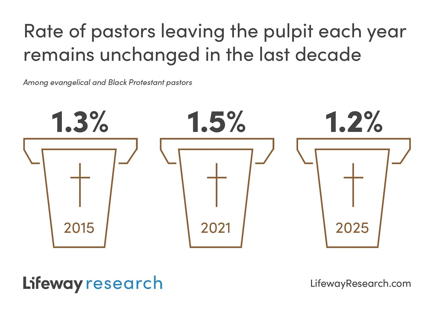 Yet, just because there is stress, fatigue and what some may define as “burnout,” it does not equate to a mass exodus from ministry. In fact, burnout does not lead to quitting any more than it ever has. A Lifeway study revealed that in a study of Protestant pastors, only around 1 in 100 leave the ministry each year. “The percentage of pastors who leave for reasons other than retirement or death has remained statistically unchanged over the past decade: 1.3% in 2015, 1.5% in 2021 and 1.2% in 2025.”6